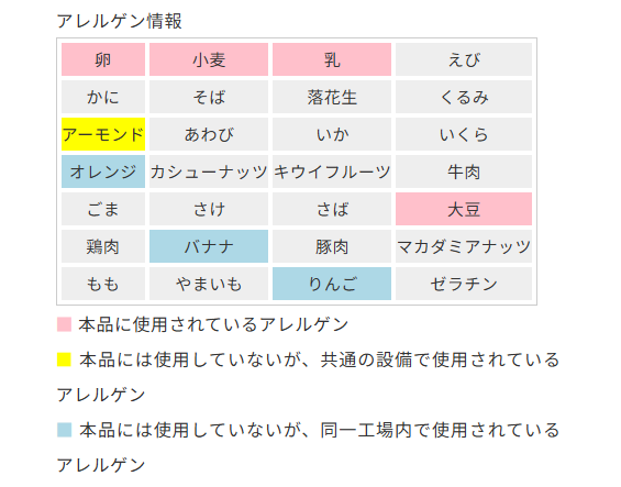 チョコレートコーチング(植物油脂、砂糖、乳糖、ココアパウダー)(国内製造)、ミックス粉(小麦粉、砂糖、ショートニング、粉末油脂(植物油脂、コーンシロップ)、ぶどう糖、でん粉、全粉乳、食塩)、食用油脂、鶏卵/加工デンプン、卵殻カルシウム、ベーキングパウダー、乳化剤(大豆由来)、ピロリン酸鉄、香料
