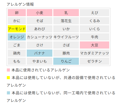 ミックス粉(小麦粉、砂糖、ショートニング、粉末油脂、その他)(国内製造)、食用油脂、油脂加工食品(砂糖、植物油脂、デキストリン)、鶏卵/加工デンプン、卵殻カルシウム、ベーキングパウダー、ピロリン酸鉄、乳化剤、香料、(一部に小麦・乳成分・卵・大豆を含む)